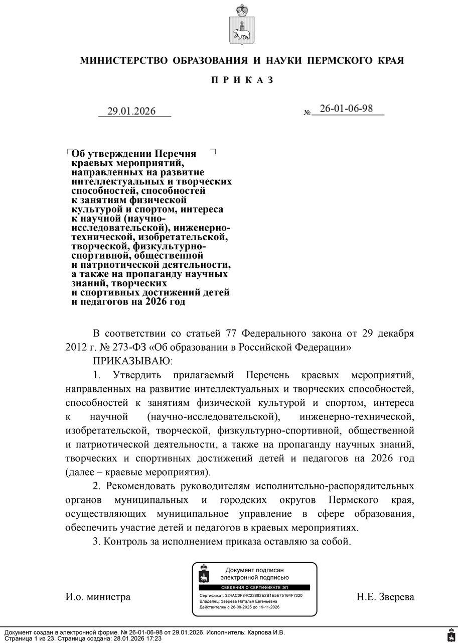 Приказ Министерства образования и науки Пермского края №26-01-06-98 от 29 января 2026 года